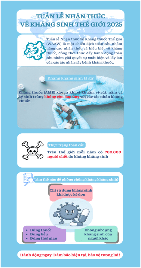 Tuần lễ nâng cao nhận thức về kháng sinh là dịp để mỗi người dân nâng cao hiểu biết, sử dụng thuốc một cách có trách nhiệm, tuân thủ chỉ định của bác sĩ, và lan tỏa thông điệp “Sử dụng kháng sinh đúng cách – bảo vệ sức khỏe cộng đồng”. Chung tay hành động hôm nay chính là cách thiết thực nhất để bảo vệ hiệu quả của kháng sinh, giữ gìn sức khỏe cho bản thân, gia đình, cộng đồng và các thế hệ mai sau.
