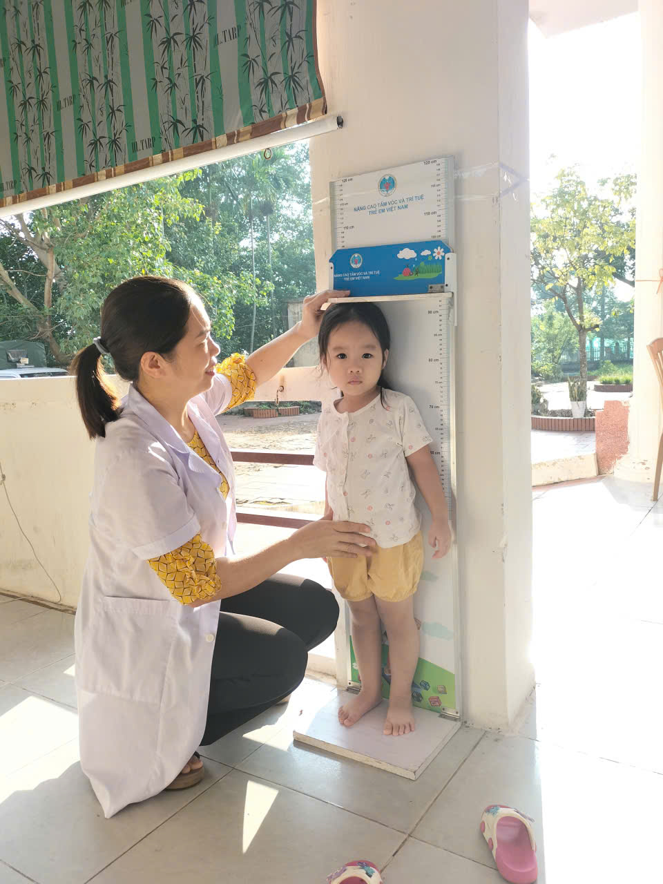 Cán bộ y tế thực hiện cân, đo cho trẻ tại cộng đồng