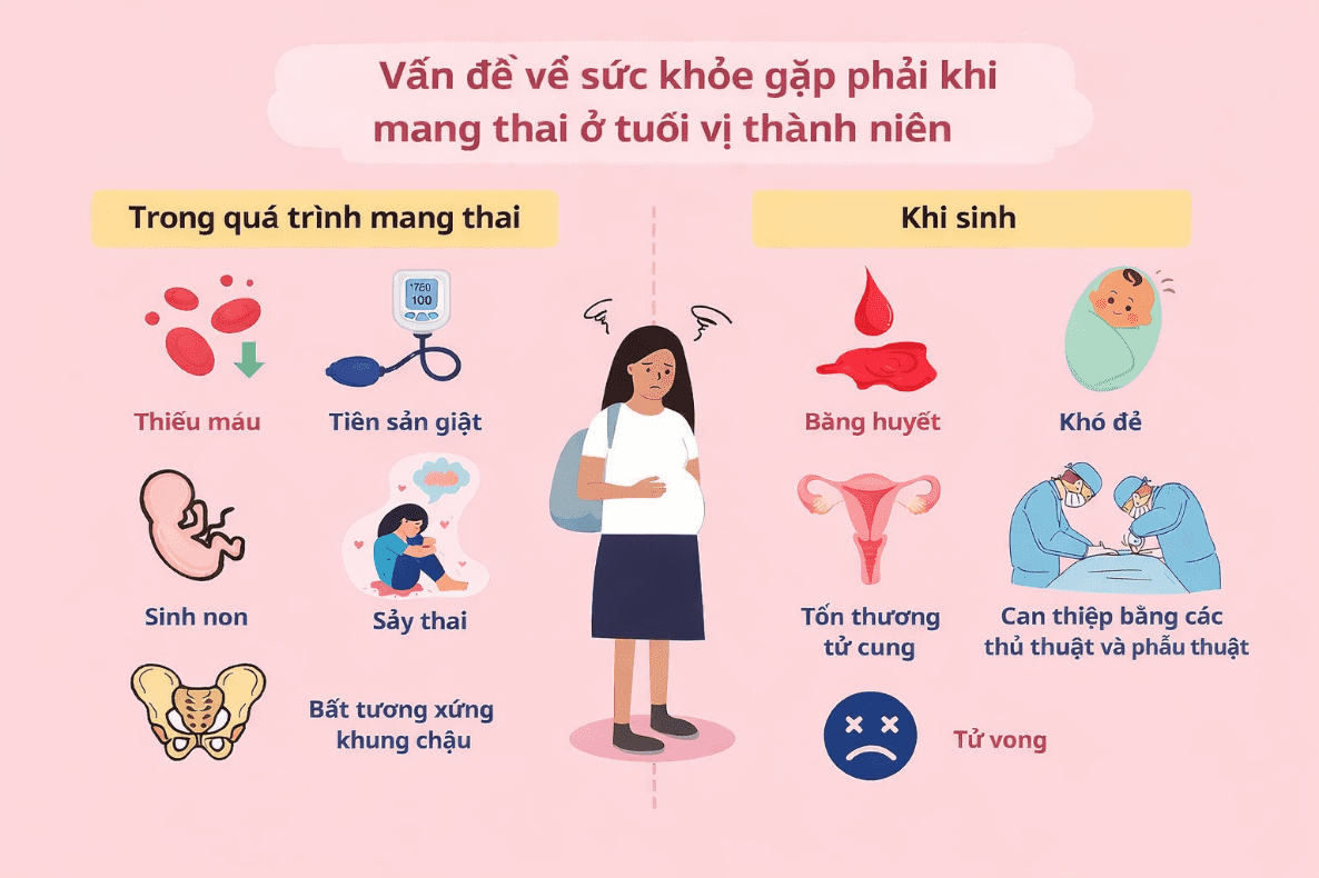 Mang thai ở tuổi vị thành niên tiềm ẩn nhiều nguy cơ đối với sức khỏe. Do cơ thể chưa phát triển hoàn thiện, các em dễ gặp các tai biến trong thai kỳ và khi sinh, ảnh hưởng lâu dài đến sức khỏe sinh sản. Việc mang thai sớm cũng thường khiến việc học tập bị gián đoạn, tạo áp lực tâm lý nặng nề, cảm giác lo lắng, mặc cảm và nguy cơ bị kỳ thị. Trong nhiều trường hợp, nạo phá thai được lựa chọn như một giải pháp bất đắc dĩ. Tuy nhiên, nếu phá thai không an toàn hoặc thực hiện tại các cơ sở không đủ điều kiện y tế, nguy cơ nhiễm trùng, băng huyết, tổn thương tử cung, thậm chí vô sinh hoặc đe dọa tính mạng là hoàn toàn có thể xảy ra.
