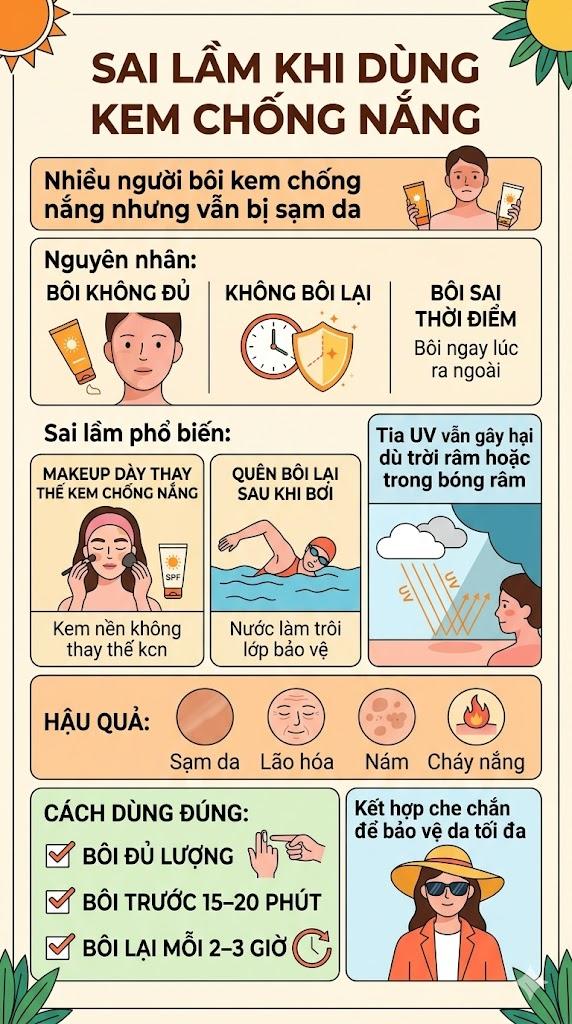 Việc dùng kem chống nắng rồi phủ lớp makeup dày có thể làm giảm hiệu quả bảo vệ. Ngoài ra, khi dặm lại kem chống nắng, nhiều người bỏ qua vì sợ ảnh hưởng lớp nền, khiến da không được bảo vệ đầy đủ.