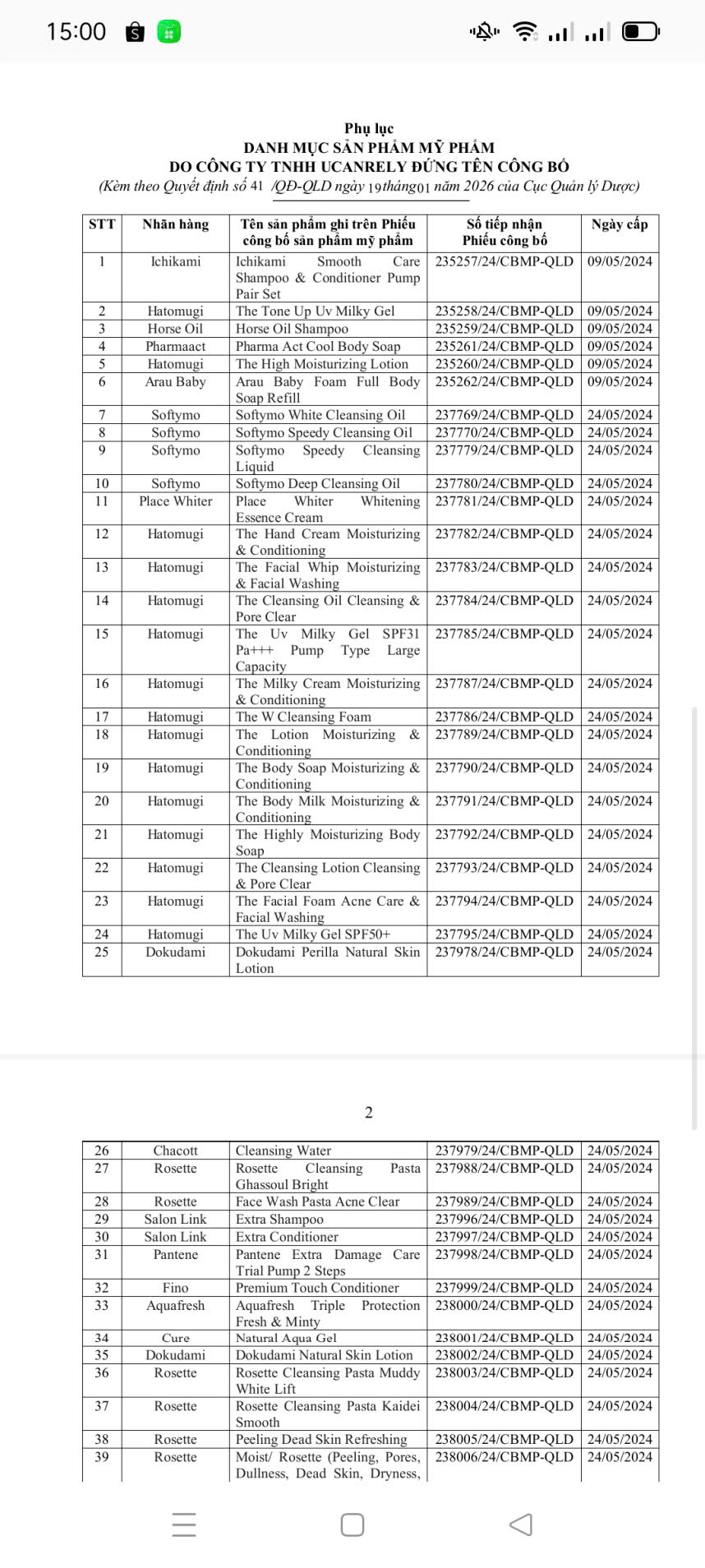Ngày 19/01/2026, Cục Quản lý Dược (Bộ Y tế) vừa ra quyết định số 41/QĐ-QLD về việc thu hồi số tiếp nhận Phiếu công bố sản phẩm mỹ phẩm và đình chỉ lưu hành, thu hồi, tiêu hủy sản phẩm mỹ phẩm của Công ty TNHH Ucanrely (Địa chỉ doanh nghiệp: Tầng 2, Số nhà 194, đường Lạc Trung, Phường Vĩnh Tuy, Thành phố Hà Nội, Mã số doanh nghiệp: 0109964482).