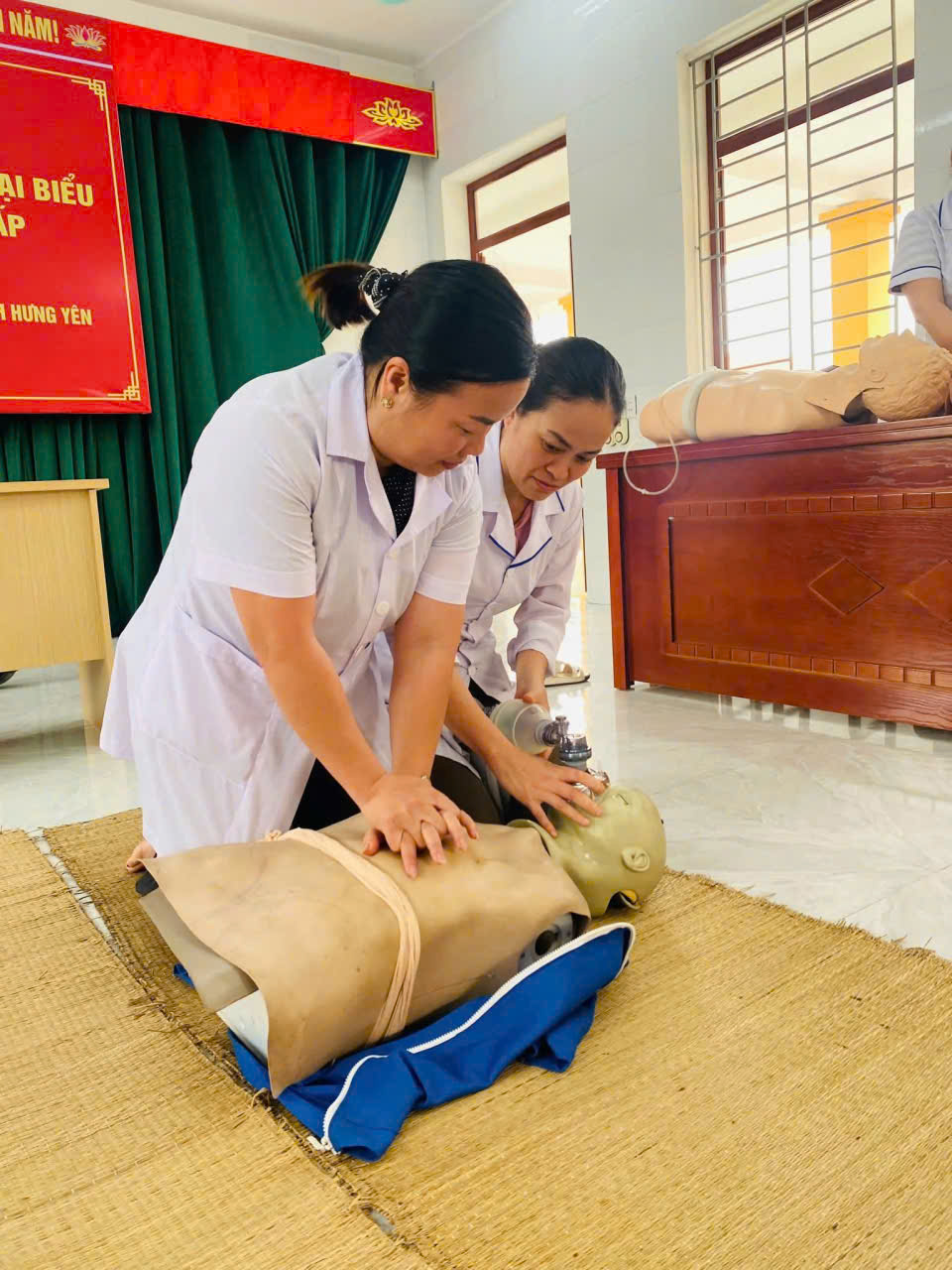 Thực hành ép tim ngoài lồng ngực, khai thông đường thở, thổi ngạt trên mô hình