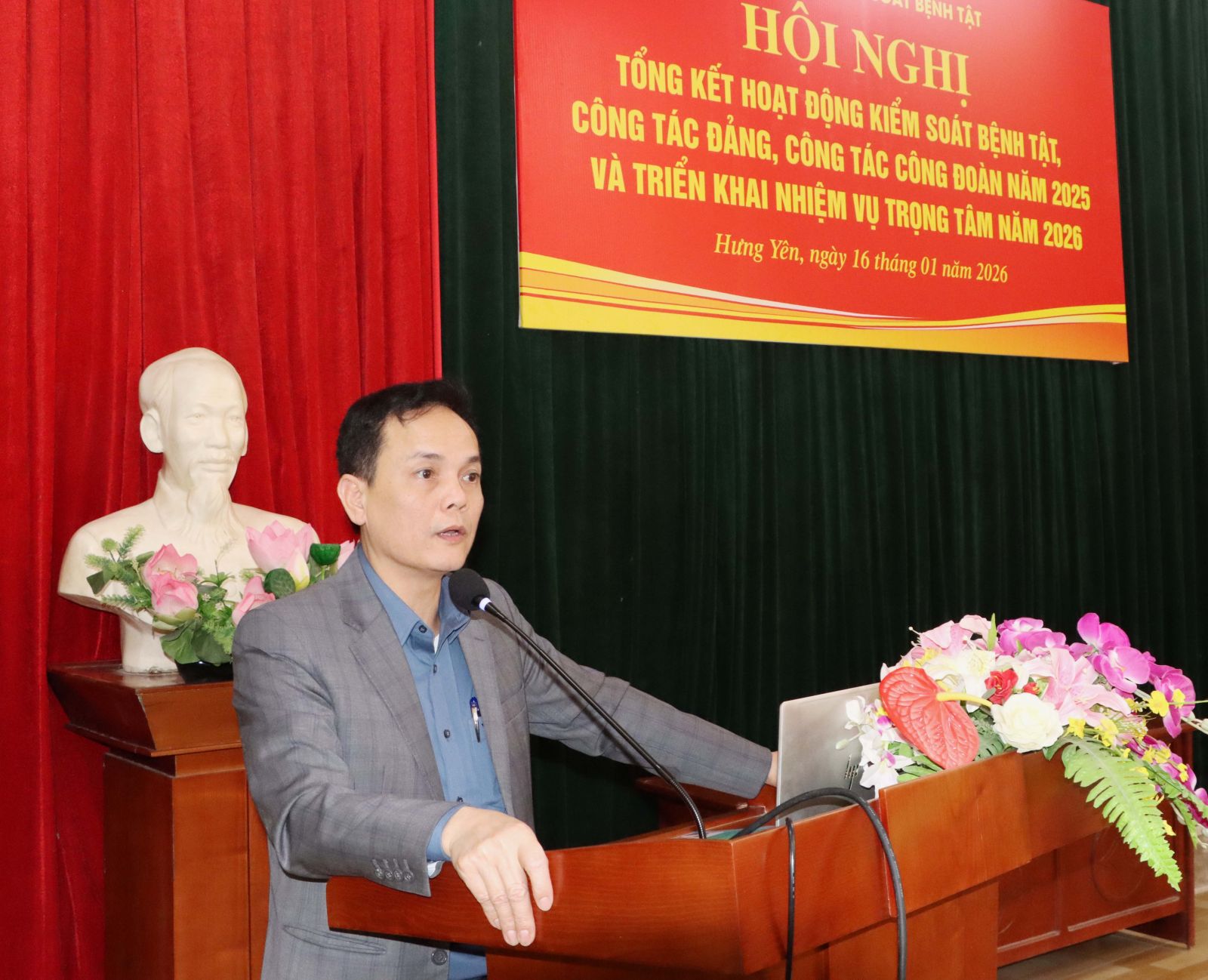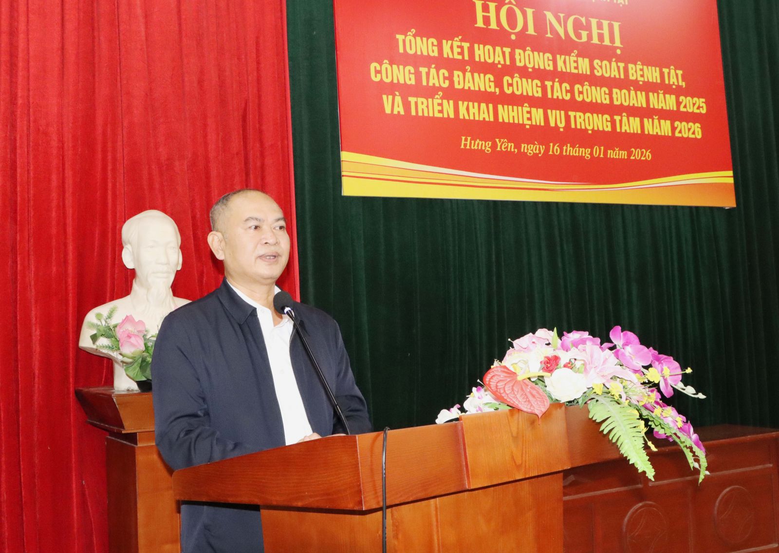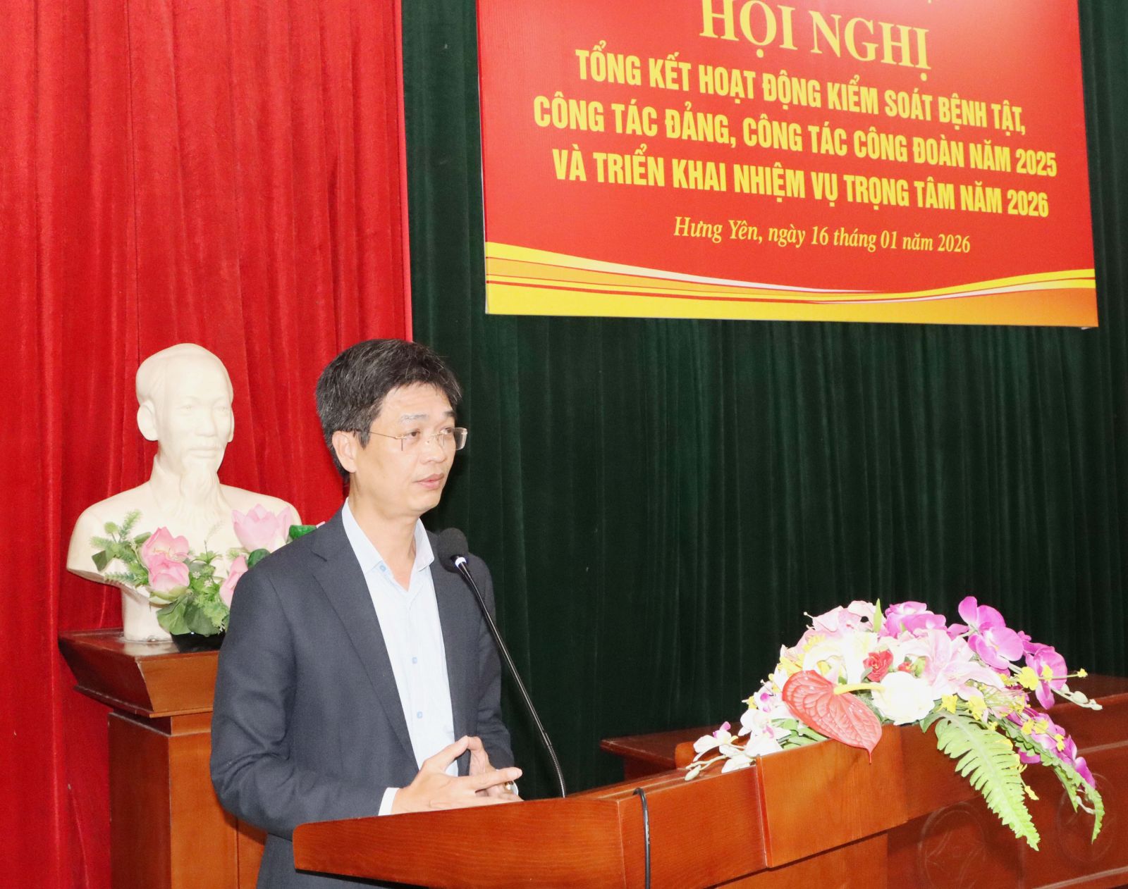 Phát biểu chỉ đạo Hội nghị, ông Nguyễn Quang Lâm, Phó Giám đốc Sở Y tế Hưng Yên đánh giá cao tinh thần đoàn kết thống nhất của tập thể Ban lãnh đạo cùng viên chức cơ quan. Sớm kiện toàn tổ chức bộ máy, hoạt động hiệu năng, hiệu lực, hiệu quả ngay sau quá trình sắp xếp. Vượt qua nhiều khó khăn, thử thách để hoàn thành các mục tiêu trong năm 2025. Trong năm 2026, trước bối cảnh, toàn ngành quyết tâm thực hiện thành công nhiều mục tiêu của Đảng, Quốc hội, HĐND tỉnh, UBDN tỉnh về chăm sóc sức khỏe nhân dân, đặc biệt là công tác phòng bệnh thì Trung tâm Kiểm soát bệnh tật cần tiếp tục nỗ lực hơn nữa. Triển khai quyết liệt các hoạt động, biện pháp chủ động phòng bệnh, kiểm soát tốt các loại dịch bệnh trên địa bàn tỉnh.