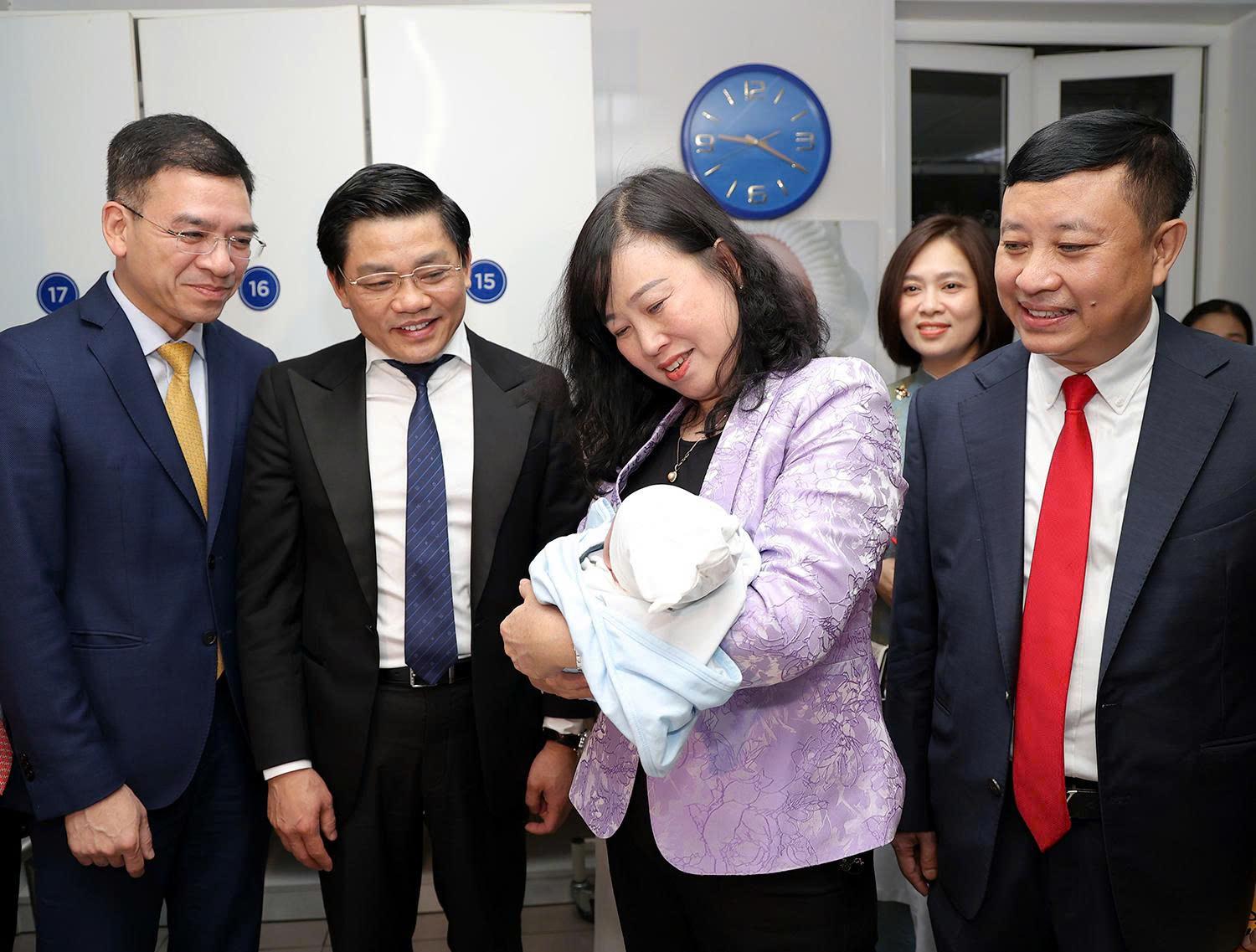 Bộ trưởng Bộ Y tế Đào Hồng Lan bế em bé vừa chào đời tại Bệnh viện Phụ sản Trung ương đêm Giao thừa.