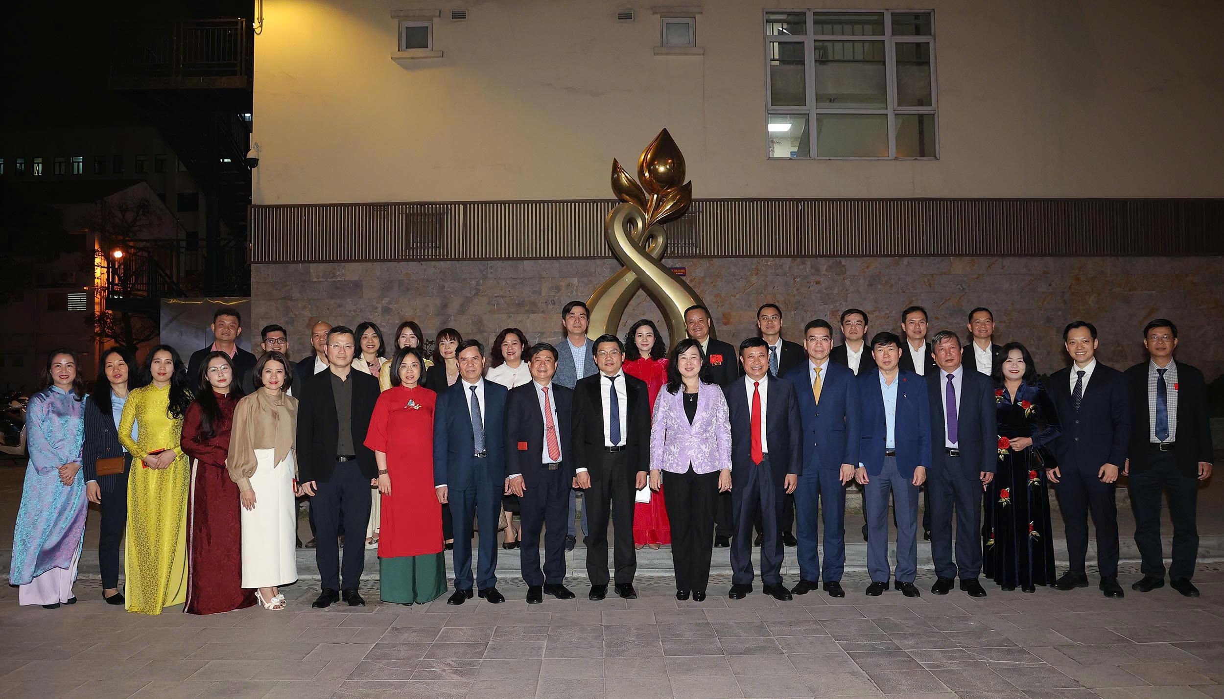 Bộ trưởng Bộ Y tế Đào Hồng Lan và cán bộ, y bác sĩ của Bệnh viện Phụ sản Trung ương trong khuôn viên của bệnh viện đêm Giao thừa.