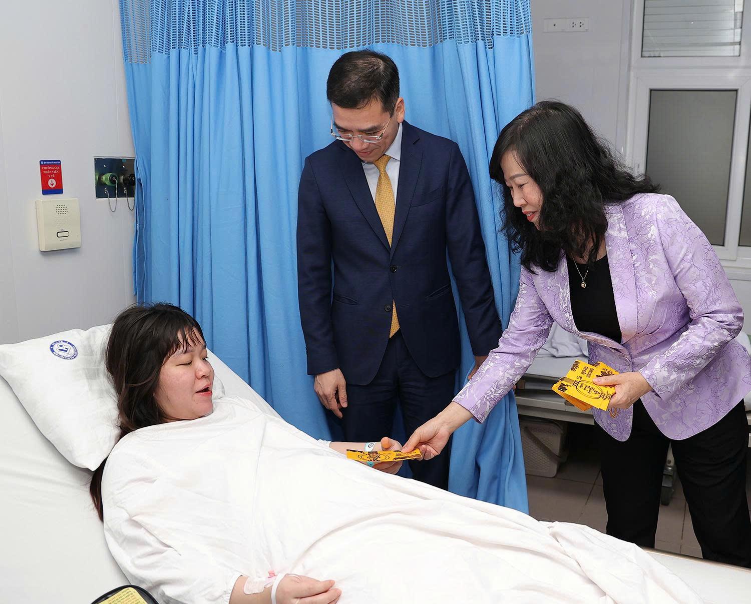 Bộ trưởng Bộ Y tế Đào Hồng Lan mừng tuổi sản phụ vừa sinh.