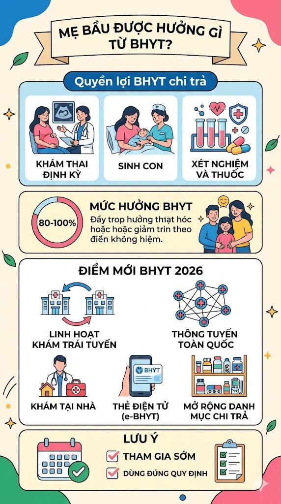 Mức hưởng tùy theo đối tượng, phổ biến từ 80% đến 100% chi phí. Đây là hỗ trợ rất lớn, đặc biệt trong các trường hợp sinh mổ hoặc có biến chứng.