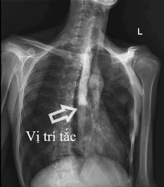 Hình ảnh vị trí bị tắc hoàn toàn thực quản đoạn 1/3 giữa.